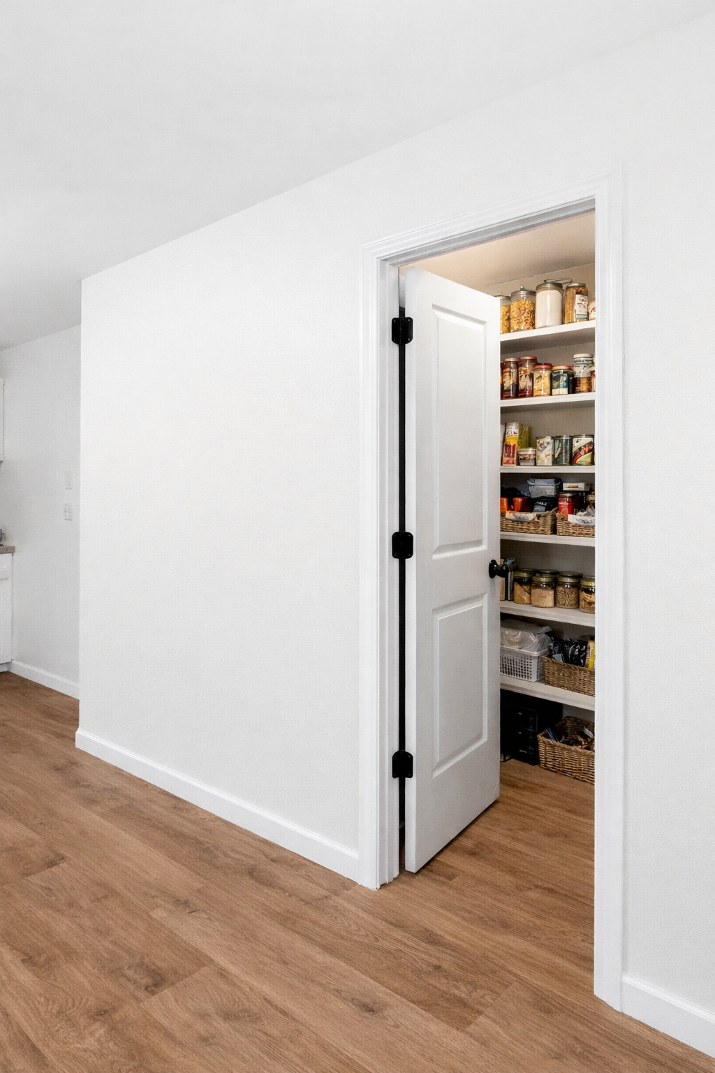 Close in the old laundry space and add a door to create a large walk-in pantry space